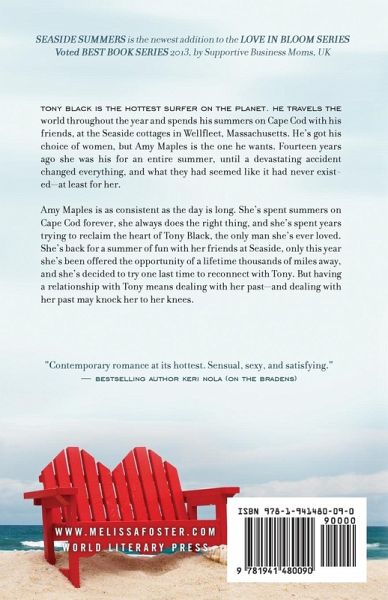 Discover the magic of New York Times bestseller Melissa Foster's writing, and see why millions of readers have fallen in love with the Love in Bloom series. **SEASIDE SECRETS is a USA TODAY BESTSELLER** In SEASIDE SECRETS... Tony Black is the hottest surfer on the planet. He travels the world throughout the year and spends his summers on Cape Cod with his friends, at the Seaside cottages in Wellfleet, Massachusetts. He's got his choice of women, but Amy Maples is the one he wants. Fourteen years ago she was his for an entire summer, until a devastating accident changed everything, and what they had seemed like it had never existed--at least for her. Amy Maples is as consistent as the day is long. She's spent summers on Cape Cod forever, she always does the right thing, and she's spent years trying to reclaim the heart of Tony Black, the only man she's ever loved. She's back for a summer of fun with her friends at Seaside, only this year she's been offered the opportunity of a lifetime thousands of miles away, and she's decided to try one last time to reconnect with Tony. But having a relationship with Tony means dealing with her past--and dealing with her past may knock her to her knees. WANT MORE SEASIDE SUMMERS? All Seaside books can be read as stand-alone novels or as part of the series: SEASIDE SUMMERS Seaside Dreams (Bella) Seaside Hearts (Jenna) Seaside Sunsets (Jamie) Seaside Secrets (Amy) Seaside Nights (Sky) Seaside Embrace (Hunter) Seaside Lovers (Grayson) Seaside Whispers (Matt)