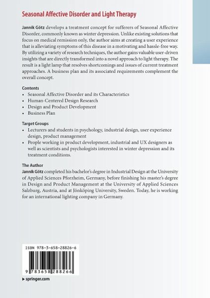 Jannik Götz develops a treatment concept for sufferers of Seasonal Affective Disorder, commonly known as winter depression. Unlike existing solutions that focus on medical remission only, the author aims at creating a user experience that is alleviating symptoms of this disease in a motivating and hassle-free way. By utilizing a variety of research techniques, the author gains valuable user-driven insights that are directly transformed into a novel approach to light therapy. The result is a light lamp that resolves shortcomings and issues of current treatment approaches. A business plan and its associated requirements complement the overall concept.
