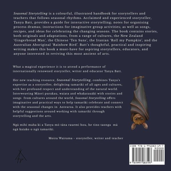 Seasonal Storytelling is a colourful, illustrated handbook for storytellers and teachers that follows seasonal rhythms. Acclaimed and experienced storyteller, Tanya Batt, provides a guide for interactive storytelling; notes for organising process dramas; instructions for imaginative group activities; as well as songs,recipes, and ideas for celebrating the changing seasons. The book contains stories, both originals and adaptations, from a range of cultures, the New Zealand 'Gingerbread Man', the Chinese 'Ten Suns', the Iranian 'Roll my Pumpkin', and the Australian Aboriginal 'Rainbow Bird'. Batt's thoughtful, practical and inspiring writing makes this book a must-have for aspiring story-tellers, educators, and anyone interested in reviving this most ancient of arts. What a magical experience it is to attend a performance of internationally renowned storyteller, writer and educator Tanya Batt. Her new teaching resource, Seasonal Storytelling, combines Tanya's expertise as a storyteller, delighting tamariki of all ages and cultures, with her profound respect and understanding of the natural world. Interweaving M¿ori purakau, waiata and whakataük¿ with stories and songs from cultures around the world, Seasonal Storytelling offers imaginative and practical ways to help tamariki celebrate and connect with the seasonal changes in Aotearoa. It also provides teachers with helpful suggestions around working with tamariki through storytelling and the arts. Ng¿ mihi maha ki a Tanya m¿ t¿na rauemi hou, he tino taonga m¿ ng¿ kaiako o ng¿ tamariki. Moira Wairama - storyteller, writer and teacher