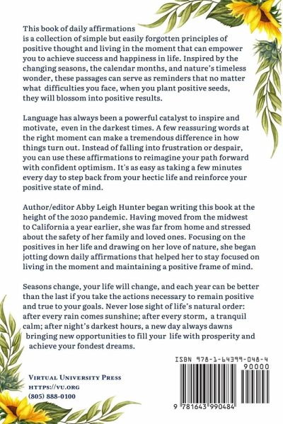 This book of daily affirmations is a collection of simple but easily forgotten principles of positive thought and living in the moment that can empower you to achieve success and happiness in life. Inspired by the changing seasons, the calendar months, and nature's timeless wonder, these passages can serve as reminders that no matter what difficulties you face, when you plant positive seeds, they will blossom into positive results. Language has always been a powerful catalyst to inspire and motivate, even in the darkest times. A few reassuring words at the right moment can make a tremendous difference in how things turn out. Instead of falling into frustration or despair, you can use these affirmations to reimagine your path forward with confident optimism. It's as easy as taking a few minutes every day to step back from your hectic life, center yourself in the present moment, and reinforce your positive state of mind. Author/editor Abby Leigh Hunter began writing this book at the height of the 2020 pandemic. Having moved from the Midwest to California a year earlier, she was far from home and stressed about the safety of her family and loved ones. Focusing on the positives in her life and drawing on her love of nature, she began jotting down daily affirmations that helped her to stay focused on living in the moment and maintaining a positive frame of mind. Seasons change, your life will change, and each year can be better than the last if you take the actions necessary to remain positive and true to your goals. Never lose sight of life's natural order: after every rain comes sunshine; after every storm, a tranquil calm; after night's darkest hours, a new day always dawns bringing new opportunities to fill your life with prosperity and achieve your fondest dreams.
