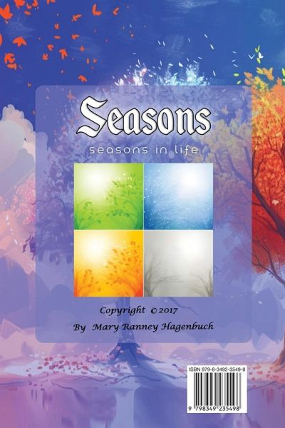 This is the story about seasons in life, of and by Mary Elizebeth Connell Ranney Hagenbuch. It depicts phases of Life which change unawares. It covers a time in history of 100 years from 1918 to 2018. The inspiration of the story comes from Mary's belief that the final judgement will reveal whether or not her life was of any significance or of bad choices. Her conclusion is that we are soldiers who do not seek happiness in life as a goal but that it is a side-effect - that there is great beauty to be found on earth, but also great danger and suffering to be experienced, This story is to show that each phase of life can include creative and diverse seasons of Poverty, and Wealth, Health and Illness, Music and Work, Art and Business, Nature improvement and of End of Life Joy.