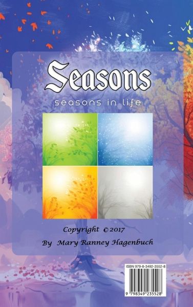 This is the story about seasons in life, of and by Mary Elizebeth Connell Ranney Hagenbuch. It depicts phases of Life which change unawares. It covers a time in history of 100 years from 1918 to 2018. The inspiration of the story comes from Mary's belief that the final judgement will reveal whether or not her life was of any significance or of bad choices. Her conclusion is that we are soldiers who do not seek happiness in life as a goal but that it is a side-effect - that there is great beauty to be found on earth, but also great danger and suffering to be experienced, This story is to show that each phase of life can include creative and diverse seasons of Poverty, and Wealth, Health and Illness, Music and Work, Art and Business, Nature improvement and of End of Life Joy.