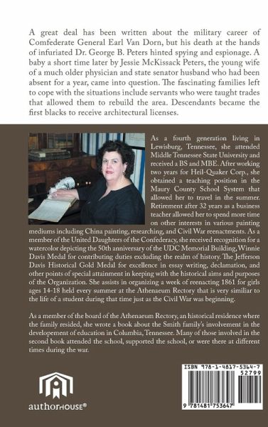 A great deal has been written about the military career of Comfederate General Earl Van Dorn, but his death at the hands of infuriated Dr. George B. Peters hinted spying and espionage. A baby a short time later by Jessie McKissack Peters, the young wife of a much older physician and state senator husband who had been absent for a year, came into question. The fascinating families left to cope with the situations include servants who were taught trades that allowed them to erebuild the area. Descendants became the first blacks to receive architectural licenses.
