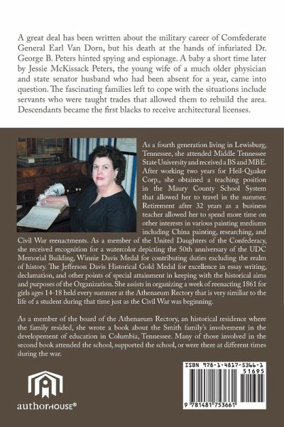 A great deal has been written about the military career of Comfederate General Earl Van Dorn, but his death at the hands of infuriated Dr. George B. Peters hinted spying and espionage. A baby a short time later by Jessie McKissack Peters, the young wife of a much older physician and state senator husband who had been absent for a year, came into question. The fascinating families left to cope with the situations include servants who were taught trades that allowed them to erebuild the area. Descendants became the first blacks to receive architectural licenses.