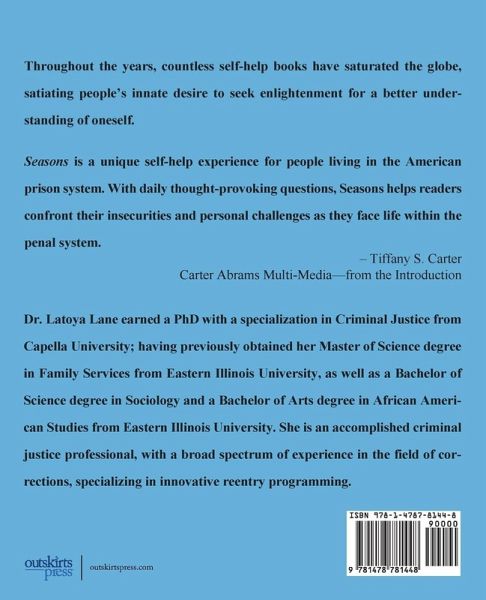 Throughout the years, countless self-help books have saturated the globe, satiating people's innate desire to seek enlightenment for a better understanding of oneself. Seasons is a unique self-help experience for people living in the American prison system. With daily thought-provoking questions, Seasons helps readers confront their insecurities and personal challenges as they face life within the penal system. - Tiffany S. Carter