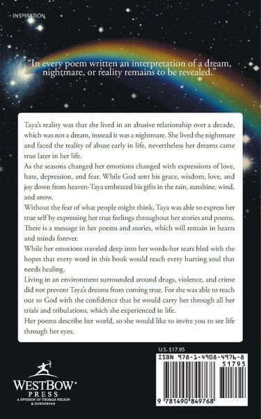 "In every poem written an interpretation of a dream, nightmare, or reality remains to be revealed." Taya's reality was that she lived in an abusive relationship over a decade, which was not a dream, instead it was a nightmare. She lived the nightmare and faced the reality of abuse early in life, nevertheless her dreams came true later in her life. As the seasons changed her emotions changed with expressions of love, hate, depression, and fear. While God sent his grace, wisdom, love, and joy down from heaven-Taya embraced his gifts in the rain, sunshine, wind, and snow. Without the fear of what people might think, Taya was able to express her true self by expressing her true feelings throughout her stories and poems. There is a message in her poems and stories, which will remain in hearts and minds forever. While her emotions traveled deep into her words-her tears bled with the hopes that every word in this book would reach every hurting soul that needs healing. Living in an environment surrounded around drugs, violence, and crime did not prevent Taya's dreams from coming true. For she was able to reach out to God with the confidence that he would carry her through all her trials and tribulations, which she experienced in life. Her poems describe her world, so she would like to invite you to see life through her eyes.