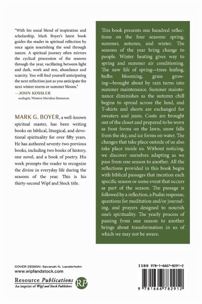 This book presents one hundred reflections on the four seasons: spring, summer, autumn, and winter. The seasons of the year bring change to people. Winter heating gives way to spring and summer air conditioning. The new life of spring--trees leafing, bulbs blooming, grass growing--brought about by rain turns into summer maintenance. Summer maintenance diminishes as the autumn chill begins to spread across the land, and T-shirts and shorts are exchanged for sweaters and jeans. Coats are brought out of the closet and prepared to be worn as frost forms on the lawn, snow falls from the sky, and ice forms on water. The changes that take place outside of us also take place inside us. Without noticing, we discover ourselves adapting as we pass from one season to another. All the reflections provided in this book begin with biblical passages that mention each specific season or some event that occurs as part of the season. The passage is followed by a reflection, a Psalm response, questions for meditation and/or journaling, and prayers designed to nourish one's spirituality. The yearly process of passing from one season to another brings about transformation in us of which we may not be aware.