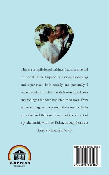 This is a compilation of writings that span a period of over 40 years. Inspired by various happenings and experiences, both socially and personally, I wanted readers to reflect on their own experiences and feelings that have impacted their lives. From earlier writings to the present, there was a shift in my views and thinking because of the impact of my relationship with the Father, through Jesus the Christ, my Lord and Savior.