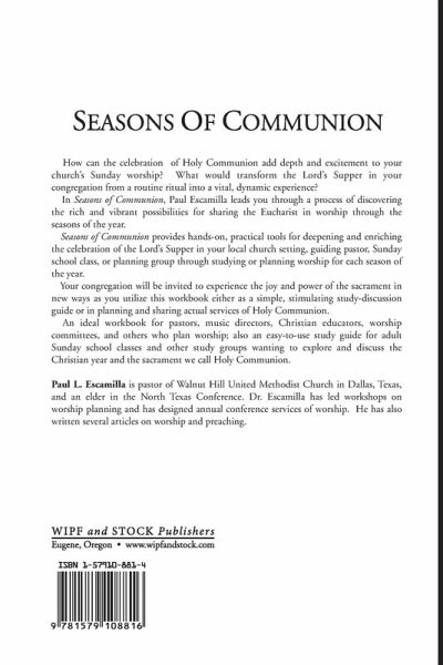 How can the celebration of Holy Communion add depth and meaning to your church's Sunday worship? What would transform the Lord's Supper in your congregation from a routine ritual into a vital, dynamic experience? In Seasons of Communion, Paul Escamilla leads you through a process of discovering the rich and vibrant possibilities for sharing the Eucharist in worship through the seasons of the year. Seasons of Communion provides hands-on, practical tolls for deepening and enriching the celebration of the Lord's Supper in your local church setting, guiding pastor, Sunday school class, or planning group through studying or planning worship for each season of the year. Your congregation will be invited to experience the joy and power of the sacrament in new ways as you utilize this workbook either as a simple, stimulating study-discussion guide or in planning and sharing actual services of Holy Communion. An ideal workbook for pastors, music directors, Christian educators, worship committees, and others who plan worship; also an easy-to-use study guide for adult Sunday school classes and other study groups wanting to explore and discuss the Christian year and the sacrament we call Holy Communion.