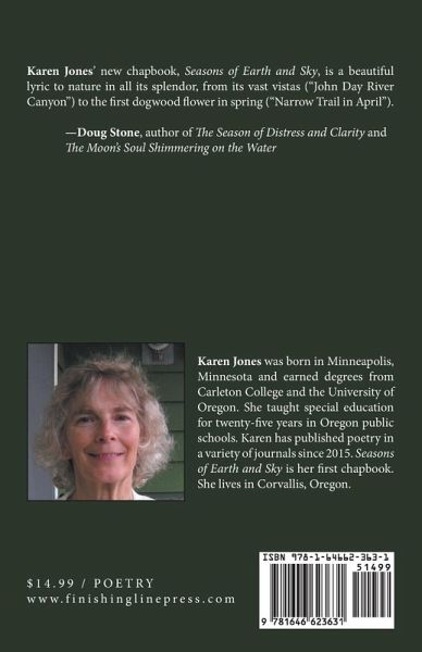 Karen Jones' new chapbook, Seasons of Earth and Sky, is a beautiful lyric to nature in all its splendor, from its vast vistas ("John Day River Canyon") to the first dogwood flower in spring ("Narrow Trail in April"). -Doug Stone, author of The Season of Distress and Clarity and The Moon's Soul Shimmering on the Water