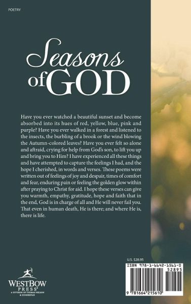 Have you ever watched a beautiful sunset and become absorbed into its hues of red, yellow, blue, pink and purple? Have you ever walked in a forest and listened to the insects, the burbling of a brook or the wind blowing the Autumn-colored leaves? Have you ever felt so alone and aftraid, crying for help from God's son, to lift you up and bring you to Him? I have experienced all these things and have attempted to capture the feelings I had, and the hope I cherished, in words and verses. These poems were written out of feelings of joy and despair, times of comfort and fear, enduring pain or…mehr