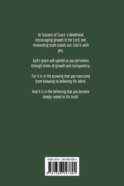 In life there are many seasons. Sometimes they take on names like: insecurity, fear, rejection, uncertainty, and loss. Sometimes the seasons are short, breezy, and endurable. Other times the seasons are cold, bitter, and seem never ending. In Seasons of Grace: A Devotional Encouraging Growth In The Lord, the believer in Christ is given encouragement to persevere triumphantly, in every season, through the grace of God. This devotional is an easy read companion to one's own bible study. Compiled into four seasons, each one touches on various issues every believer has had to face. Filled with beautiful photography and key bible verses relating to each topic, this devotional gives a testament to God's enduring grace and faithfulness for the believer to hold onto.