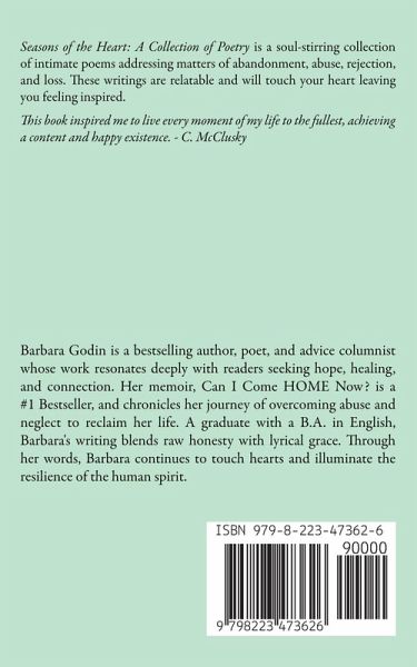 Barbara Godin is a bestselling author, poet, and advice columnist whose work resonates deeply with readers seeking hope, healing, and connection. Her memoir, Can I Come HOME Now?, a #1 Bestseller, chronicles her journey of overcoming abuse and neglect to reclaim her life, inspiring countless readers to rise above their own challenges. Barbara's latest poetry collection, Seasons of the Heart, captures the beauty and complexity of human emotion, while her Words of Wisdom series, drawn from her beloved "Dear Barb" columns, offers practical guidance and heartfelt insights. A graduate with a B.A. in English, Barbara's writing blends raw honesty with lyrical grace. When not crafting stories or advice, she enjoys walking, hiking, biking, and spending quiet moments with her cherished cat. Through her words, Barbara continues to touch hearts and illuminate the resilience of the human spirit.