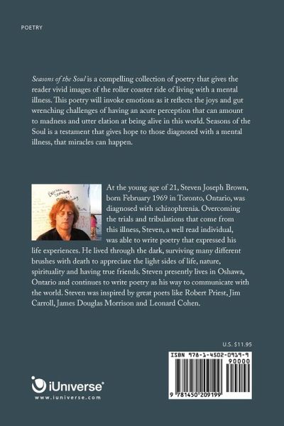 Seasons of the Soul is a compelling collection of poetry that gives the reader vivid images of the roller coaster ride of living with a mental illness. This poetry will invoke emotions as it reflects the joys and gut wrenching challenges of having an acute perception that can amount to madness and utter elation at being alive in this world. Seasons of the Soul is a testament that gives hope to those diagnosed with a mental illness, that miracles can happen.