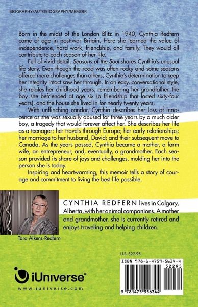 Born in the midst of the London Blitz in 1940, Cynthia Redfern came of age in post-war Britain. Here she learned the value of independence, hard work, friendship, and family. They would all contribute to each season of her life. Full of vivid detail, Seasons of the Soul shares Cynthia's unusual life story. Even though the road was often rocky and some seasons offered more challenges than others, Cynthia's determination to keep her integrity intact saw her through. In an easy, conversational style, she relates her childhood years, remembering her grandfather, the boy she befriended at age six (a friendship that lasted sixty-four years), and the house she lived in for nearly twenty years. With unflinching candor, Cynthia describes her loss of innocence as she was sexually abused for three years by a much older boy, a tragedy that would forever affect her. She describes her life as a teenager; her travels through Europe; her early relationships; her marriage to her husband, David; and their subsequent move to Canada. As the years passed, Cynthia became a mother, a farm wife, an entrepreneur, and, eventually, a grandmother. Each season provided its share of joys and challenges, molding her into the person she is today. Inspiring and heartwarming, this memoir tells a story of courage and commitment to living the best life possible.