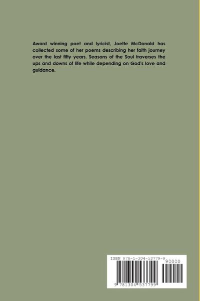 Award winning poet and lyricist, Joette McDonald has collected some of her poems describing her faith journey over the last fifty years. Seasons of the Soul traverses the ups and downs of life while depending on God's love and guidance.