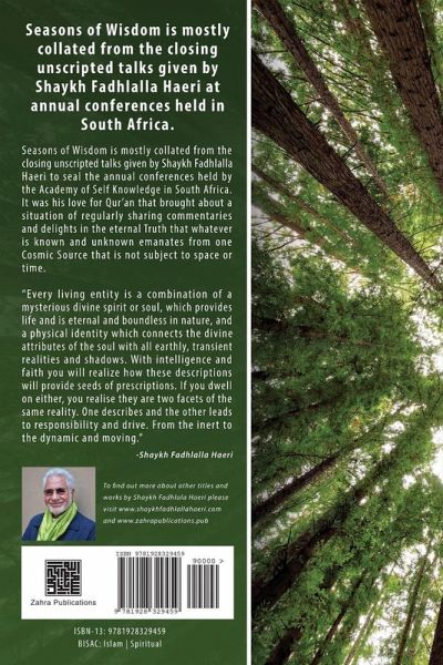 Seasons of Wisdom is mostly collated from the closing unscripted talks given by Shaykh Fadhlalla Haeri at annual conferences held in South Africa. Seasons of Wisdom is mostly collated from the closing unscripted talks given by Shaykh Fadhlalla Haeri to seal the annual conferences held by the Academy of Self Knowledge in South Africa. It was his love for Qur'an that brought about a situation of regularly sharing commentaries and delights in the eternal Truth that whatever is known and unknown emanates from one Cosmic Source that is not subject to space or time. "Every living entity is a combination of a mysterious divine spirit or soul, which provides life and is eternal and boundless in nature, and a physical identity which connects the divine attributes of the soul with all earthly, transient realities and shadows. With intelligence and faith you will realize how these descriptions will provide seeds of prescriptions. If you dwell on either, you realise they are two facets of the same reality. One describes and the other leads to responsibility and drive. From the inert to the dynamic and moving." Shaykh Fadhlalla Haeri