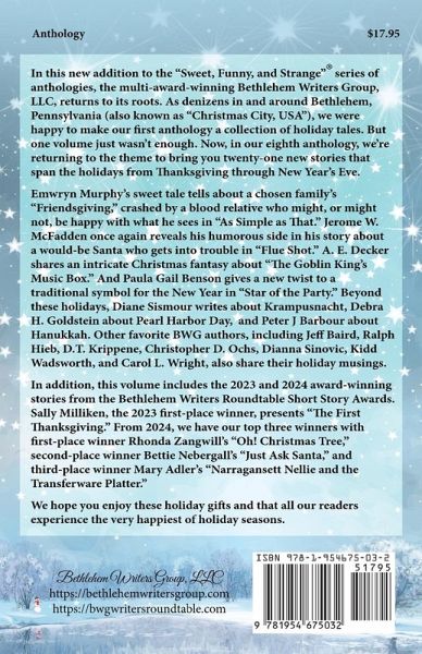 In this new addition to the "Sweet, Funny, and Strange"® series of anthologies, the multi-award-winning Bethlehem Writers Group, LLC, returns to its roots. As denizens in and around Bethlehem, Pennsylvania (also known as "Christmas City, USA"), we were happy to make our first anthology a collection of holiday tales. But one volume just wasn't enough. Now, in our eighth anthology, we're returning to the theme to bring you twenty-one new stories that span the holidays from Thanksgiving through New Year's Eve. Emwryn Murphy's sweet tale tells about a chosen family's "Friendsgiving," crashed by a blood relative who might, or might not, be happy with what he sees in "As Simple as That." Jerome W. McFadden once again reveals his humorous side in his story about a would-be Santa who gets into trouble in "Flue Shot." A. E. Decker shares an intricate Christmas fantasy about "The Goblin King's Music Box." And Paula Gail Benson gives a new twist to a traditional symbol for the New Year in "Star of the Party." Beyond these holidays, Diane Sismour writes about Krampusnacht, Debra H. Goldstein about Pearl Harbor Day, and Peter J Barbour about Hanukkah. Other favorite BWG authors, including Jeff Baird, Ralph Hieb, D.T. Krippene, Christopher D. Ochs, Dianna Sinovic, Kidd Wadsworth, and Carol L. Wright, also share their holiday musings. In addition, this volume includes the 2023 and 2024 award-winning stories from the Bethlehem Writers Roundtable Short Story Awards. Sally Milliken, the 2023 first-place winner, presents "The First Thanksgiving." From 2024, we have our top three winners with first-place winner Rhonda Zangwill's "Oh! Christmas Tree," second-place winner Bettie Nebergall's "Just Ask Santa," and third-place winner Mary Adler's "Narragansett Nellie and the Transferware Platter." We hope you enjoy these holiday gifts and that all our readers experience the very happiest of holiday seasons.