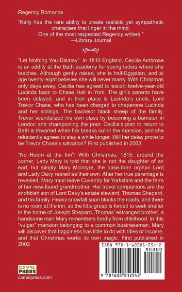 "Let Nothing You Dismay": In 1810 England, Cecilia Ambrose is an oddity at the Bath academy for young ladies where she teaches. Although gently raised, she is half-Egyptian, and at age twenty-eight believes she will never marry. With Christmas only days away, Cecilia has agreed to escort twelve-year-old Lucinda back to Chase Hall in York. The girl's parents have been delayed, and in their place is Lucinda's uncle, Lord Trevor Chase, who has been charged to chaperone Lucinda and her siblings. The bachelor black sheep of the family, Trevor scandalized his own class by becoming a barrister in London and championing the poor. Cecilia's plan to return to Bath is thwarted when fire breaks out in the mansion, and she reluctantly agrees to stay a while longer. Will her delay prove to be Trevor Chase's salvation? First published in 2003. "No Room at the Inn": With Christmas, 1815, around the corner, Lady Mary is told that she is not the daughter of an earl, but simply Mary McIntyre, the base-born orphan Lord and Lady Davy reared as their own. After her true parentage is revealed, Mary must leave Coventry for Yorkshire and the farm of her new-found grandmother. Her travel companions are the snobbish son of Lord Davy's estate steward, Thomas Shepard, and his family. Heavy snowfall soon blocks the roads, and there is no room at the inn, so the little group is forced to seek shelter in the home of Joseph Shepard, Thomas' estranged brother, a handsome man Mary remembers fondly from childhood. In this "vulgar" mansion belonging to a common businessman, Mary will discover that happiness has little to do with titles or income, and that Christmas works its own magic. First published in 2002.