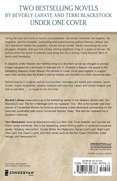 A compilation of two bestselling novels by Beverly LaHaye and Terri Blackstock come together under one cover. In Seasons Under Heaven, four families living on a Southern cul-de-sac struggle to arrange a heart transplant for a terminally ill nine-year-old. In Showers in Season, the sequel to the bestselling Seasons Under Heaven, the families of Cedar Circle band together to support each other as they face the threat of marital infidelity and the birth of a Down Syndrome baby. Behind brightly lit windows and on front porches, marriages are tested and mended, hearts broken, hopes resurrected, dreams released and reformed, values and futures shaped, and faith rekindled ... or found for the first time. Taking the best and worst of human circumstances---the tender moments, the laughter, the tragedies, and the triumphs---bestselling and award-winning authors Beverly LaHaye and Terri Blackstock weave from them two poignant, warmly human novels. Gently uncovering the inner struggles, stresses, and joys that surface among neighbors living on a quiet cul-de-sac, the authors show you the power of ordinary lives being knit into a strong, many-textured fabric of family and friendships.