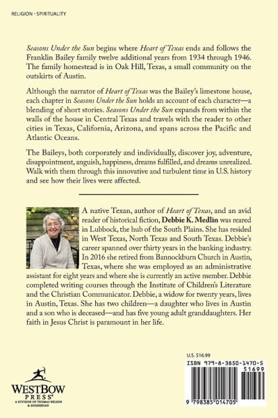 Seasons Under the Sun begins where Heart of Texas ends and follows the Franklin Bailey family twelve additional years from 1934 through 1946. The family homestead is in Oak Hill, Texas, a small community on the outskirts of Austin. Although the narrator of Heart of Texas was the Bailey's limestone house, each chapter in Seasons Under the Sun holds an account of each character-a blending of short stories. Seasons Under the Sun expands from within the walls of the house in Central Texas and travels with the reader to other cities in Texas, California, Arizona, and spans across the Pacific and Atlantic Oceans. The Baileys, both corporately and individually, discover joy, adventure, disappointment, anguish, happiness, dreams fulfilled, and dreams unrealized. Walk with them through this innovative and turbulent time in U.S. history and see how their lives were affected.