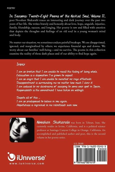 In Seasons: Twenty-Eight Poems of the Naked Soul, Volume II, poet Nooshan Shekarabi traces an interesting and dark journey over the past two years of her life. She writes bravely and honestly about love, hope, anguish, injustice, family, friendship, success, and longing. Her poetry is raw and filled with emotion that depicts the thoughts and feelings of an old soul in a young woman's mind and body. No matter our situation, we sometimes endure painful breakups. We are disappointed, ignored, and marginalized by others; we experience financial ups and downs. We worry about our families' well-being-and we survive. The poems in this collection examine the reality of those dark places and of our ability to find hope again. Irony I am so broken that I am unable to recall the feeling of being whole. Exhaustion is a disposition I've grown to expect. I am so angry that I am unable to manifest my rage effectively. Disappointment is surrounding me no matter how much I deny it. I am seduced by my daydreams of escaping to some cozy spot in Spain. Responsibility is the commitment I have taken on willingly. Despite all of this ... I am so predisposed to believe in you again. Hopefulness is ingrained in me relentlessly even now.