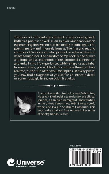 The poems in this volume chronicle my personal growth both as a poetess as well as an Iranian-American woman experiencing the dynamics of becoming middle-aged. The poems are raw and intensely honest. The first and second volumes of Seasons are also present in volume three in descending order. The narrative of my work is one of love and hope, and a celebration of the emotional connection and unity in the life experiences which shape us as adults. In every poem, you will find the common thread of love realized, as the title of this volume implies. In every poem, you may find a fragment of yourself in an intricate detail or some nostalgia in the emotion it evokes.