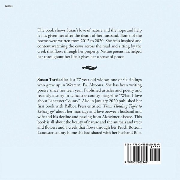 The book shows Susan's love of nature and the hope and helps it has given her after the death of her husband. Some of the poems were written from 2012 to 2020. She feels inspired and content watching the cows across the road and sitting by the creek that flows through her property. Nature poems have helped her throughout her life it gives her a sense of peace.