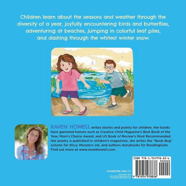 Children learn about the seasons and weather through the diversity of a year, joyfully encountering birds and butterflies, adventuring at beaches, jumping in colorful leaf piles, and dashing through the whitest winter snow.