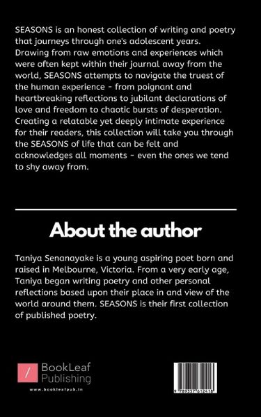 SEASONS is an honest collection of writing and poetry that journeys through one's adolescent years. Drawing from raw emotions and experiences which were often kept within their journal away from the world, SEASONS attempts to navigate the truest of the human experience - from poignant and heartbreaking reflections to jubilant declarations of love and freedom to chaotic bursts of desperation. Creating a relatable yet deeply intimate experience for their readers, this collection will take you through the SEASONS of life that can be felt and acknowledges all moments - even the ones we tend to shy away from.
