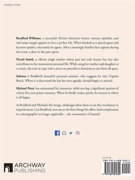 Bradford Williams, a successful African American lawyer, venture capitalist, and real estate mogul appears to live a perfect life. When booked as a special guest and keynote speaker, reluctantly he agrees. After a seemingly familiar face appears during the event, a door to the past opens. Nicole Smith, a vibrant single mother whose past not only haunts her, but also contributes to her nonexistent personal life. While using her mother and daughter as a crutch, she tries to cope with a secret so powerful it threatens to tear them all apart. Sabrina is Bradford's beautiful personal assistant, who suggests he visit Virginia Beach. When it is discovered she has her own agenda, threads begin to unravel. Michael Perry has maintained his innocence while serving a significant portion of a forty-five-year prison sentence. When he finally makes parole, he returns to where it all began. As Bradford and Michael's life merge, challenges allow them to see the true beauty in imperfections. Can Bradford, now use to the finer things life offers, find completeness in a demographic no longer applicable....the community of Seatack?