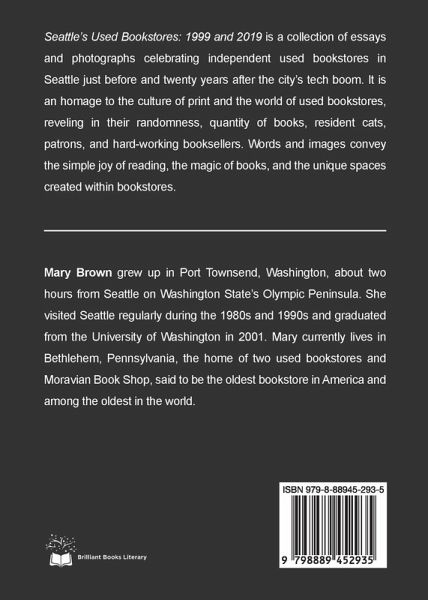 Seattle's Used Bookstores: 1999 and 2019 is a collection of essays and photographs celebrating independent used bookstores in Seattle just before and twenty years after the city's tech boom. It is an homage to the culture of print and the world of used bookstores, reveling in their randomness, quantity of books, resident cats, patrons, and hard-working booksellers. Words and images convey the simple joy of reading, the magic of books, and the unique spaces created within bookstores.