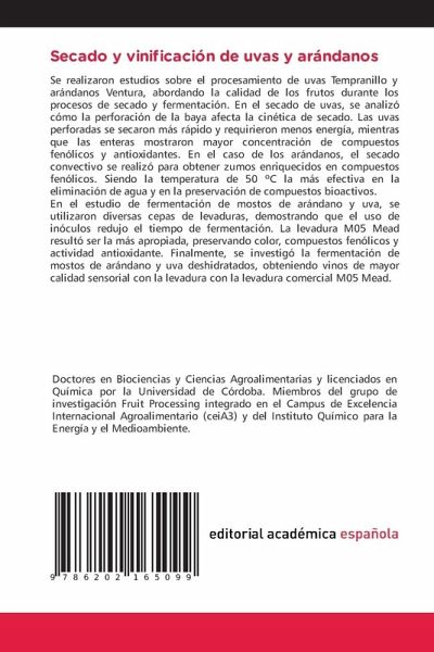 Se realizaron estudios sobre el procesamiento de uvas Tempranillo y arándanos Ventura, abordando la calidad de los frutos durante los procesos de secado y fermentación. En el secado de uvas, se analizó cómo la perforación de la baya afecta la cinética de secado. Las uvas perforadas se secaron más rápido y requirieron menos energía, mientras que las enteras mostraron mayor concentración de compuestos fenólicos y antioxidantes. En el caso de los arándanos, el secado convectivo se realizó para obtener zumos enriquecidos en compuestos fenólicos. Siendo la temperatura de 50 ºC la más efectiva en la eliminación de agua y en la preservación de compuestos bioactivos.En el estudio de fermentación de mostos de arándano y uva, se utilizaron diversas cepas de levaduras, demostrando que el uso de inóculos redujo el tiempo de fermentación. La levadura M05 Mead resultó ser la más apropiada, preservando color, compuestos fenólicos y actividad antioxidante. Finalmente, se investigó la fermentación de mostos de arándano y uva deshidratados, obteniendo vinos de mayor calidad sensorial con la levadura con la levadura comercial M05 Mead.