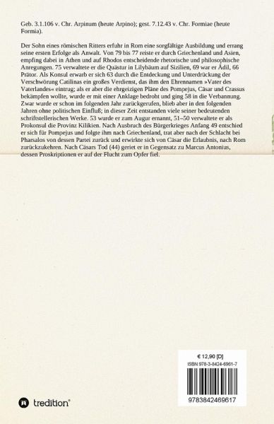 Marcus Tullius Cicero (106-43 v. Chr.) römischer Staatsmann, Redner und Philosoph, studierte Recht, Rhetorik, Literatur und Philosophie in Rom. Sein Durchbruch als Anwalt und Politiker gelang ihm 70 v. Chr. im Prozess gegen Verres, 64 v. Chr. wurde er gegen Catilina zum Konsul gewählt. Als dieser einen Staatsstreich zum Sturz der Regierung organisierte, deckte Cicero die Verschwörung auf und ließ Angehörige der Gruppe hinrichten. Nach einjährigem Exil wurde er von Pompeius nach Rom zurückgerufen. Cicero wurde am 7. Dezember 43 v. Chr. ermordet.