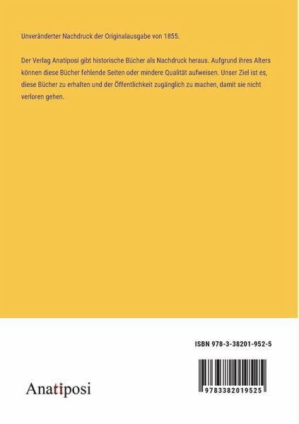 Unveränderter Nachdruck der Originalausgabe von 1855. Der Verlag Anatiposi gibt historische Bücher als Nachdruck heraus. Aufgrund ihres Alters können diese Bücher fehlende Seiten oder mindere Qualität aufweisen. Unser Ziel ist es, diese Bücher zu erhalten und der Öffentlichkeit zugänglich zu machen, damit sie nicht verloren gehen.