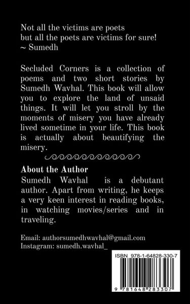 Not all the victims are poets but all the poets are victims for sure! ~ Sumedh Secluded Corners is a collection of poems and two short stories by Sumedh Wavhal. This book will allow you to explore the land of unsaid things. It will let you stroll by the moments of misery you have already lived sometime in your life. This book is actually about beautifying the misery.