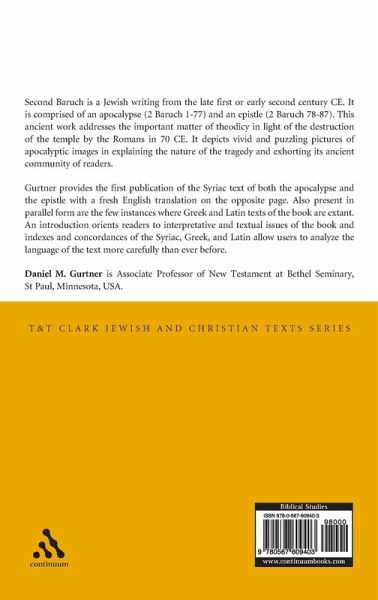 2 Baruch is a Jewish pseudepigraphon from the late first or early second century CE. It is comprised of an apocalypse (2 Baruch 1-77) and an epistle (2 Baruch 78-87). This ancient work addresses the important matter of theodicy in light of the destruction of the temple by the Romans in 70 CE. It depicts vivid and puzzling pictures of apocalyptic images in explaining the nature of the tragedy and exhorting its ancient community of readers. Gurtner provides the first publication of the Syriac of both the apocalypse and epistle with a fresh English translation on the opposite page. Also present in parallel form are the few places where Greek and Latin texts of the book. An introduction orients readers to interpretative and textual issues of the book. Indexes and Concordances of the Syriac, Greek, and Latin will allow users to analyze the language of the text more carefully than ever before.