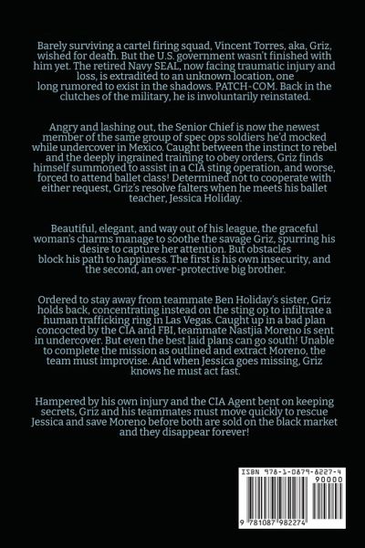 He gave all to protect an innocent life, but his country wanted more! Barely surviving a cartel firing squad, Vincent Torres, aka, Griz, wished for death. But the U.S. government wasn't finished with him yet. The retired Navy SEAL, now facing traumatic injury and loss, is extradited to an unknown location, one long rumored to exist in the shadows. PATCH-COM. Back in the clutches of the military, he is involuntarily reinstated. Angry and lashing out, the Senior Chief is now the newest member of the same group of spec ops soldiers he'd mocked while undercover in Mexico. Caught between the instinct to rebel and the deeply ingrained training to obey orders, Griz finds himself summoned to assist in a CIA sting operation, and worse, forced to attend ballet class! Determined not to cooperate with either request, Griz's resolve falters when he meets his ballet teacher, Jessica Holiday. Beautiful, elegant, and way out of his league, the graceful woman's charms manage to soothe the savage Griz, spurring his desire to capture her attention. But obstacles block his path to happiness. The first is his own insecurity, and the second, an over-protective big brother. Ordered to stay away from teammate Ben Holiday's sister, Griz holds back, concentrating instead on the sting op to infiltrate a human trafficking ring in Las Vegas. Caught up in a bad plan concocted by the CIA and FBI, teammate Nastjia Moreno is sent in undercover. But even the best laid plans can go south! Unable to complete the mission as outlined and extract Moreno, the team must improvise. And when Jessica goes missing, Griz knows he must act fast. Hampered by his own injury and the CIA Agent bent on keeping secrets, Griz and his teammates must move quickly to rescue Jessica and save Moreno before both are sold on the black market and they disappear forever!