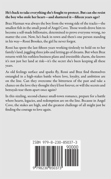 He's back to take everything she's fought to protect. But can she resist the boy who stole her heart-and shattered it-fifteen years ago? Brax Harman was always the boy from the wrong side of the tracks-the smallest fish in the small pond of Angel Cove. Those words drove him to become a self-made billionaire, determined to prove everyone wrong, no matter the cost. Now, he's back in town and there's one person standing in his way-Rossi Brookes, the girl he never forgot. Rossi has spent the last fifteen years working tirelessly to hold on to her family's land, juggling three jobs and letting go of dreams. But when Brax returns with his ruthless business plans and irresistible charm, she knows it's not just her land at risk-it's the secret she's been keeping all these years. As old feelings surface and sparks fly, Rossi and Brax find themselves entangled in a high-stakes battle where love, loyalty, and ambition are on the line. Can they overcome the bitterness of the past and take a chance on the love they thought they'd lost forever, or will the secrets and betrayals tear them apart once again? In this sizzling, second-chance small-town romance, prepare for a battle where hearts, legacies, and redemption are on the line. Because in Angel Cove, the stakes are high, and the greatest challenge of all might just be finding the courage to love again.