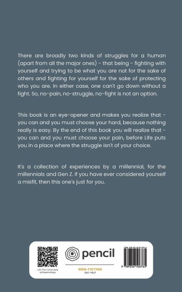 There are broadly two kinds of struggles for a human (apart from all the major ones) - that being - fighting with yourself and trying to be what you are not for the sake of others and fighting for yourself for the sake of protecting who you are. In either case, one can't go down without a fight. So, no-pain, no-struggle, no-fight is not an option. This book in an eye-opener and makes you realize that - you can and you must choose your hard, because nothing really is easy. By the end of this book you will realize that - you can and you must choose your pain, before Life puts you in a place where the struggle isn't of your choice. It's a collection of experiences by a millennial, for the millennials and Gen Z. If you have ever considered yourself a misfit, then this one's just for you.