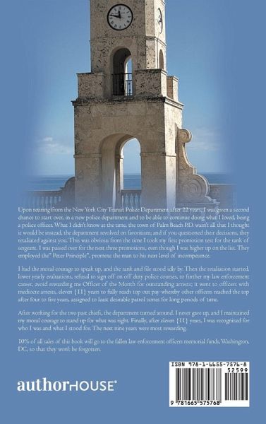 Upon retiring from the New York City Transit Police Department after 22 years, I was given a second chance to start over, in a new police department and to be able to continue doing what I loved, being a police officer. What I didn't know at the time, the town of Palm Beach P.D. wasn't all that I thought it would be instead, the department revolved on favoritism; and if you questioned their decisions, they retaliated against you. This was obvious from the time I took my first promotion test for the rank of sergeant. I was passed over for the next three promotions, even though I was higher up on the list. They employed the" Peter Principle", promote the man to his next level of incompetence. I had the moral courage to speak up, and the rank and file stood idly by. Then the retaliation started, lower yearly evaluations, refusal to sign off on off duty police courses, to further my law enforcement career, avoid rewarding me Officer of the Month for outstanding arrests; it went to officers with mediocre arrests, eleven {11} years to fully reach top out pay whereby other officers reached the top after four to five years, assigned to least desirable patrol zones for long periods of time. After working for the two past chiefs, the department turned around. I never gave up, and I maintained my moral courage to stand up for what was right. Finally, after eleven {11} years, I was recognized for who I was and what I stood for. The next nine years were most rewarding. 10% of all sales of this book will go to the fallen law enforcement officers memorial funds, Washington, DC, so that they won't be forgotten.