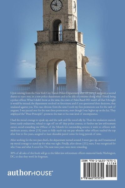 Upon retiring from the New York City Transit Police Department after 22 years, I was given a second chance to start over, in a new police department and to be able to continue doing what I loved, being a police officer. What I didn't know at the time, the town of Palm Beach P.D. wasn't all that I thought it would be instead, the department revolved on favoritism; and if you questioned their decisions, they retaliated against you. This was obvious from the time I took my first promotion test for the rank of sergeant. I was passed over for the next three promotions, even though I was higher up on the list. They employed the" Peter Principle", promote the man to his next level of incompetence. I had the moral courage to speak up, and the rank and file stood idly by. Then the retaliation started, lower yearly evaluations, refusal to sign off on off duty police courses, to further my law enforcement career, avoid rewarding me Officer of the Month for outstanding arrests; it went to officers with mediocre arrests, eleven {11} years to fully reach top out pay whereby other officers reached the top after four to five years, assigned to least desirable patrol zones for long periods of time. After working for the two past chiefs, the department turned around. I never gave up, and I maintained my moral courage to stand up for what was right. Finally, after eleven {11} years, I was recognized for who I was and what I stood for. The next nine years were most rewarding. 10% of all sales of this book will go to the fallen law enforcement officers memorial funds, Washington, DC, so that they won't be forgotten.