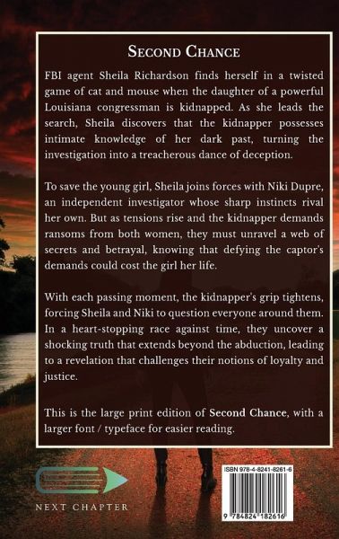 FBI agent Sheila Richardson finds herself entangled in a twisted game of cat and mouse when the daughter of a powerful Louisiana congressman is kidnapped. As she leads the desperate search, Sheila discovers that the kidnapper possesses intimate knowledge of her dark past, turning the investigation into a treacherous dance of deception. To save the young girl, Sheila joins forces with Niki Dupre, an independent investigator whose sharp instincts rival her own. But as tensions rise and the kidnapper demands ransoms from both women, they must unravel a web of secrets and betrayal, knowing that defying the captor's demands could cost the girl her life. With each passing moment, the kidnapper's grip tightens, forcing Sheila and Niki to question everyone around them. In a heart-stopping race against time, they uncover a shocking truth that extends beyond the abduction, leading to a devastating revelation that challenges their notions of loyalty and justice. This is the large print edition of Second Chance, with a larger font / typeface for easier reading.