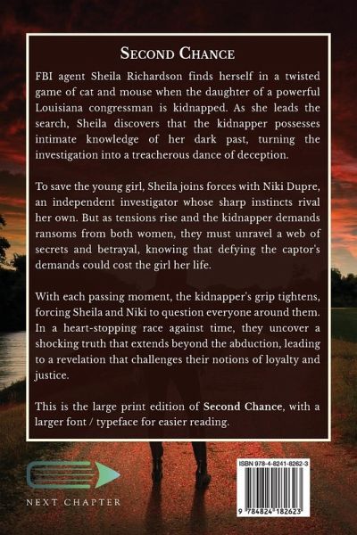 FBI agent Sheila Richardson finds herself entangled in a twisted game of cat and mouse when the daughter of a powerful Louisiana congressman is kidnapped. As she leads the desperate search, Sheila discovers that the kidnapper possesses intimate knowledge of her dark past, turning the investigation into a treacherous dance of deception. To save the young girl, Sheila joins forces with Niki Dupre, an independent investigator whose sharp instincts rival her own. But as tensions rise and the kidnapper demands ransoms from both women, they must unravel a web of secrets and betrayal, knowing that defying the captor's demands could cost the girl her life. With each passing moment, the kidnapper's grip tightens, forcing Sheila and Niki to question everyone around them. In a heart-stopping race against time, they uncover a shocking truth that extends beyond the abduction, leading to a devastating revelation that challenges their notions of loyalty and justice. This is the large print edition of Second Chance, with a larger font / typeface for easier reading.