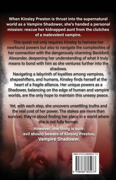 When Kinsley Preston is thrust into the supernatural world as a Vampire Shadower, she's handed a personal mission: rescue her kidnapped aunt from the clutches of a malevolent vampire. This quest not only requires Kinsley to harness her newfound powers but also to navigate the complexities of her connection with the dangerously charming Beckford Alexander, deepening her understanding of what it truly means to bond with him as she ventures further into the shadows. Navigating a labyrinth of loyalties among vampires, shapeshifters, and humans, Kinsley finds herself at the heart of a fragile alliance. Her unique powers as a Shadower, balancing on the edge of human and vampire worlds, are the only hope to maintain this uneasy peace. Yet, with each step, she uncovers unsettling truths and the real cost of her power. The stakes are more than survival; they're about finding her place in a world where she is not fully human. However, one thing is sure: evil should beware of Kinsley Preston, Vampire Shadower.