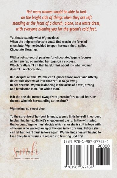 Forget love - just pass the chocolates! (and the coffee, blanket, tissues and a good book to read) Alone. No groom. All eyes on her...it's a brides worst nightmare. Left at the alter, everyone blaming her for the groom's cold feet, all Wynne can do is place a smile on her face and take one step forward: right into the arms of chocolate, because, chocolate is a jilted bride's best friend, after all. With a not-so-secret passion for chocolate, Wynne focuses all her energy on making her new business venture - Chocolate Blessings, a store full of chocolate and gifts, a success. Which really isn't all that hard, think about it - what woman doesn't like chocolate? But, despite all this, Wynne can't ignore those sweet and utterly delectable dreams of love that refuse to go away. In her dreams, Wynne is dancing in the arms of a very strong and handsome man. But which man? Is it the one she turned away from years before out of fear, or the one who left her standing at the altar? Wynne has no sweet clue. To the surprise of her best friends, Wynne finds herself knee-deep in planning her ex-fiancé's engagement party. In the whirlwind that occurs, Wynne must decide which man she is still in love with - the one who walked away or the one in her dreams. This sweet romance is sure to touch your heart and have you looking for some chocolate to eat. This novel is a Christian / Inspirational Romance. Steena Marie is the softer, sweeter side of NY Times and USA Today Bestselling Author Steena Holmes. Writing as Steena Marie, you can expect stories filled with sweet treats, honest hearts and the craving to having something warm in your hand to drink.