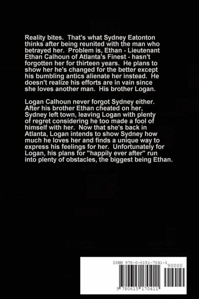 Reality bites. That's what Sydney Eatonton thinks after being reunited with the man who betrayed her. Problem is, Ethan - Lieutenant Ethan Calhoun of Atlanta's Finest - hasn't forgotten her for thirteen years. He plans to show her he's changed for the better except his bumbling antics alienate her instead. He doesn't realize his efforts are in vain since she loves another man. His brother Logan. Logan Calhoun never forgot Sydney either. After his brother Ethan cheated on her, Sydney left town, leaving Logan with plenty of regret considering he too made a fool of himself with her. Now that she's back in Atlanta, Logan intends to show Sydney how much he loves her and finds a unique way to express his feelings for her. Unfortunately for Logan, his plans for "happily ever after" run into plenty of obstacles, the biggest being Ethan.