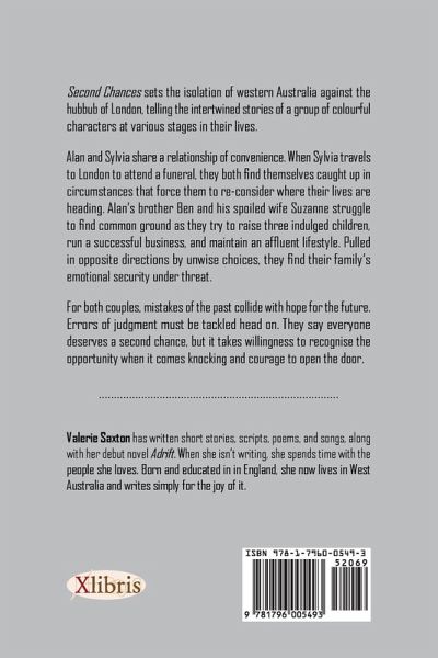 Second Chances sets the isolation of western Australian against the hubbub of London, telling the intertwined stories of a group of colourful characters at various stages in their lives. Alan and Sylvia share a relationship of convenience. When Sylvia travels to London to attend a funeral, they both find themselves caught up in circumstances that force them to re-consider where their lives are heading. Alan's brother Ben and his spoiled wife Suzanne struggle to find common ground as they try to raise three indulged children, run a successful business, and maintain an affluent lifestyle. Pulled in opposite directions by unwise choices, they find their family's emotional security under threat. For both couples, mistakes of the past collide with hope for the future. Errors of judgment must be tackled head on. They say everyone deserves a second chance, but it takes willingness to recognise the opportunity when it comes knocking and courage to open the door.