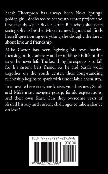 Sarah Thompson has always been Nova Springs' golden girl - dedicated to her youth center project and best friends with Olivia Carter. But when she starts seeing Olivia's brother Mike in a new light, Sarah finds herself questioning everything she thought she knew about love and friendship. Mike Carter has been fighting his own battles, focusing on his sobriety and rebuilding his life in the town he never left. The last thing he expects is to fall for his sister's best friend. As he and Sarah work together on the youth center, their long-standing friendship begins to spark with undeniable chemistry. In a town where everyone knows your business, Sarah and Mike must navigate gossip, family expectations, and their own fears. Can they overcome years of shared history and current challenges to take a chance on love?