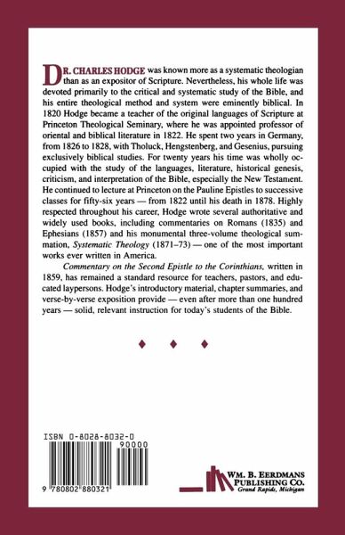 Dr. Charles Hodge was known more as a systematic theologian than as an expositor of Scripture. Nevertheless, his whole life was devoted primarily to the critical and systematic study of the Bible. "Commentary on the Second Epistle to the Corinthians" has remained a standard resource for teachers, pastors, and educated laypersons. Hodge's introductory material, chapter summaries, and verse-by-verse exposition provide - even after more than one hundred years - solid, relevant instructions for today's students of the Bible.